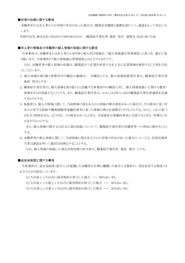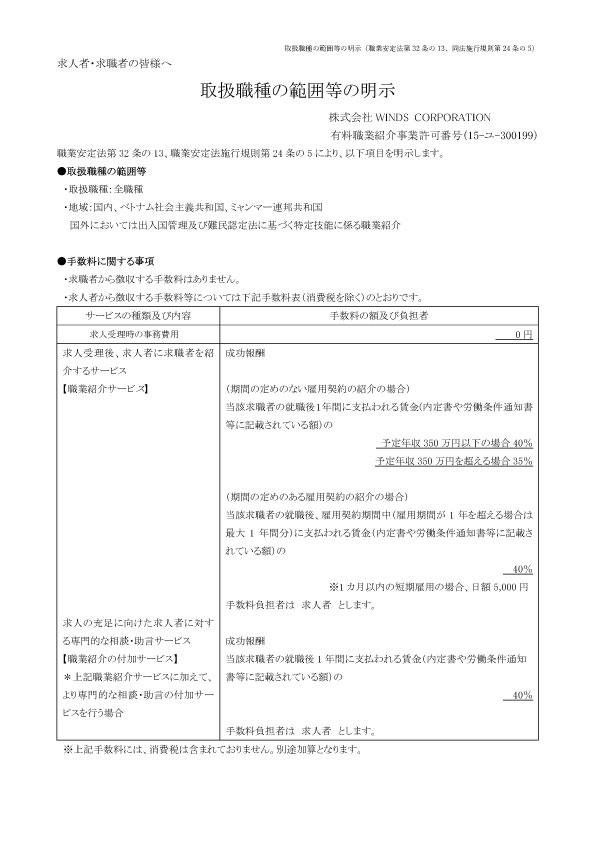 弊社、職業紹介事業につきまして 取扱職種の範囲等の明示をいたします。 こちらからダウンロードも可能です。 取扱職種の範囲等の明示 初回紹介手数料0円キャンペーンのお知らせ 前の記事 業務の運営に関する規程の明示 次の記事